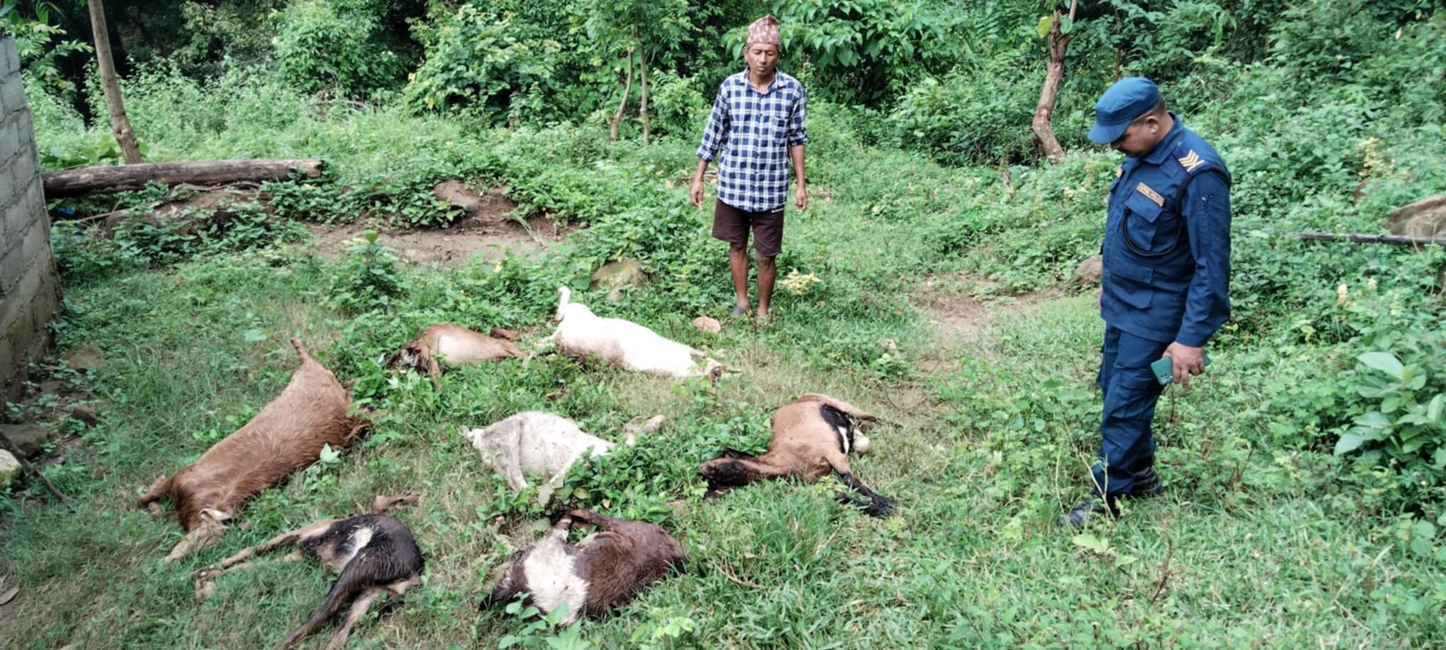 मरेका बाख्रालाई झन्डै एक किलोमिटरमा फेला पारिएको थियो । देउराली-पारे सामुदायिक वन क्षेत्रमा उक्त बाख्रालाई बाघले शिकार बनाएको हो ।
