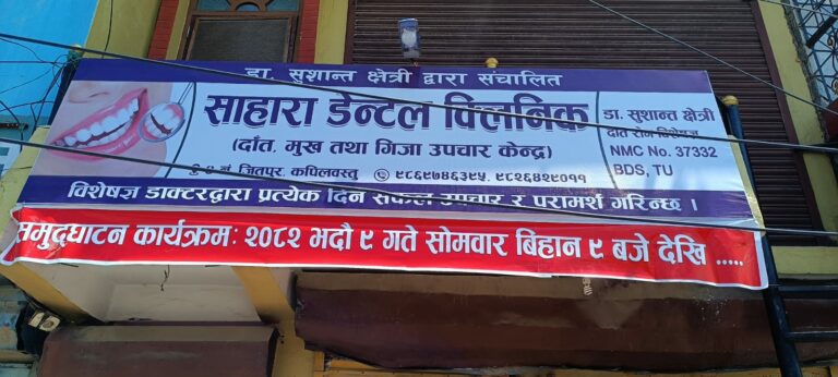 कपिलवस्तुको वाणगंगाको चारनम्बर स्थित तौलिहवा रोडमा आधुनिक सेवा सुविधासहित साहारा डेन्टल क्लिनिक सञ्चालनमा आएको छ । दाँत, मुख गिजा सम्बन्धी सम्पूर्ण समस्या समाधान गर्ने उद्देश्यले क्लिनिकले अत्याधुनिक प्रविधि र विशेषज्ञ चिकित्सकहरू मार्फत सेवा दिन सुरु गरेको हो।