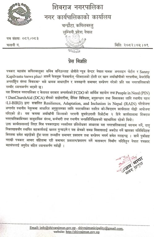 नगर प्रमुख थापाले भनेका छन्-‘ शिवराजको टोली दर खान नरपानीमा, मेयरदेखि अन्तर्राष्ट्रिय संस्था विवादमा भन्ने शिर्षकको समाचार भ्रामक, आधारहीन र मनगणन्ते समाचार सम्प्रेषण गरेको प्रति यस नगरपालिकाको गम्भीर ध्यानाकर्षण भएको छ ।’ बिज्ञप्तिमा जनाइए अनुसार एक अन्तर्राष्ट्रिय संस्थाको दुई दिने कार्यशाला गोष्ठीको लागि नरपानी पुगिएको हो । उक्त कार्यक्रमले नगरपालिकाको हितमा र समुदायको विकासमा सहकार्य रहेको स्पष्ट पारेको छ । विकासमा अवरोध गर्ने खालका गतिविधी समाचार सम्प्रेषण नगर्न विज्ञप्ती मार्फत सचेत गराइएको छ । समाचारमा व्यक्तिगत प्रतिशोध साध्न खोजिएको र सिङ्गो नगरलाई बदनाम गर्न खोजिएको भन्दै नगर प्रमुख थापाले उल्लेख गरेका छन् ।