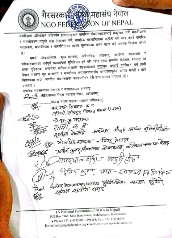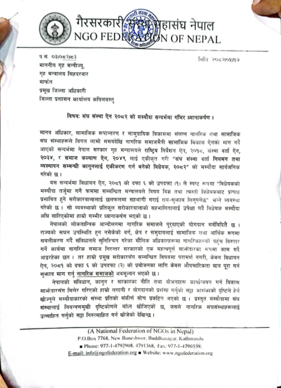 लोकतान्त्रिक मूल्य–मान्यता, संवैधानिक अधिकार, नागरिक स्वतन्त्रता र सरोकारवालाको अर्थपूर्ण सहभागिता सुनिश्चित हुने गरी “संघ संस्था सम्बन्धि विधेयक, २०८२” मा रहेका त्रुटिहरु तत्काल सच्याई पूर्नलेखन गर्न माग गरेको छ । ध्यानाकर्षपत्र बुझ्दै प्रमुख जिल्ला अधिकारी दिल कुमार तामाङले पत्रलाई आफुले गृहमन्त्रालय समक्ष बुझाउने बचनबद्धता जनाए । ध्यानाकर्षण पत्र बुझाउँदै गैर सरकारी महासंघका पूर्व अध्यक्ष प्रविण श्रीवास्तवलले लोकतन्त्रका मूख्य साझेदारका रुपमा रहेका नागरिक संघ संस्थालाई सहजीकरण तथा नियमन भन्दा पनि नियन्त्रण गर्ने उद्देश्यले प्रेरित मस्यौदाको पूनःलेखन माग आग्रह गर्नुभयो ।