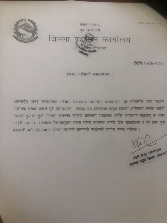 सहायक प्रमुख जिल्ला अधिकारी पदमलाल लामिछानेले निकालेको बिज्ञप्तिमा भनिएको छ, ‘अनलाइन खबर लगायतका सञ्चार माध्यममा प्रकाशित समाचारमा पूर्व प्रतिनिधि सभा सदस्य अभिषेक प्रसाद शाहले पूर्व प्रधानमन्त्री विरुद्ध यस जिल्लाका प्रमुख जिल्ला अधिकारी मार्फत जाहेरी दिएको कुरामा कुनै सत्यता नभएको व्यहोरा जानकारी गराईन्छ।’