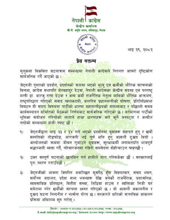 कांग्रसले ुजेन–जीु आन्दोलनका क्रममा भएको तोडफोड, आगजनी र कुटपिटका घटनाको छानबिन गर्न माग गरेको छ । यस्तै कांग्रेसले प्रतिनिधिसभा विघटनको कार्य पूर्णरूपमा अलोकतान्त्रिक र असंवैधानिक रहेको दोहोर्‍याएको छ ।