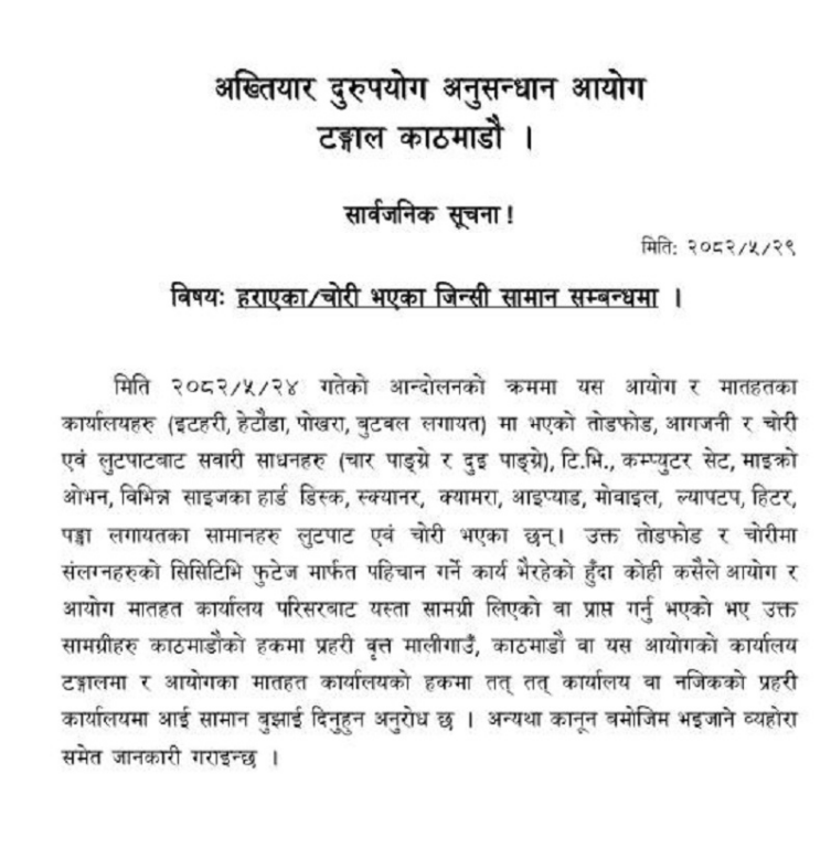 अख्तियार दुरूपयोग अनुसन्धान आयोगले विभिन्न कार्यालयबाट लुटपाट भएका सामान फिर्ता गर्न आग्रह गरेको छ । आयोगले सूचना निकालेर इटहरी, हेटौंडा, पोखरा, बुटवललगायत कार्यालयमा तोडफोड र आगजनी गरेर लुटपाट भएका उपकरणहरू फिर्ता गर्न भनेको हो ।