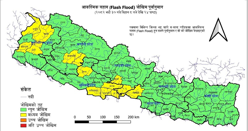साथै ताप्लेजुङ, सङ्खुवासभा, दोलखा, सिन्धुपाल्चोक, काठमाण्डौ, ललितपुर, भक्तपुर, काभ्रेपलाञ्चोक, पर्वत, बागलुङ, तनहुँ, कास्की, गुल्मी, रुकुम पूर्व, सुर्खेत, बैतडी, कैलाली र आसपासका जिल्ला भई बहने नदी, खोलामा पनि आकस्मिक बाढीको जोखिम रहेको महाशाखाले जनाएको छ ।
