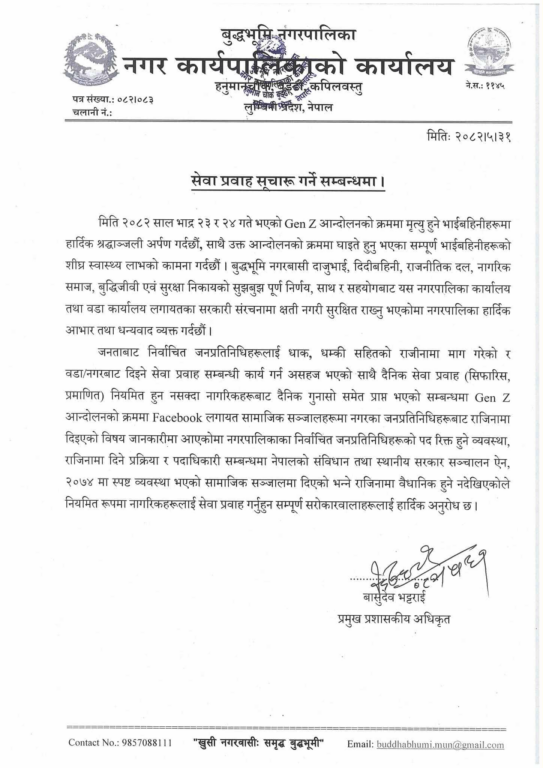 नगरपालिकाले यसबारे भ्रममा नपर्न सबै सरोकारवालालाई आग्रह गर्दै नियमितरूपमा नागरिकलाई दैनिक सेवा—सुविधा ९सिफारिस, दर्ता लगायत० सुचारु रूपमा प्रवाह भइरहने जनाएको छ ।