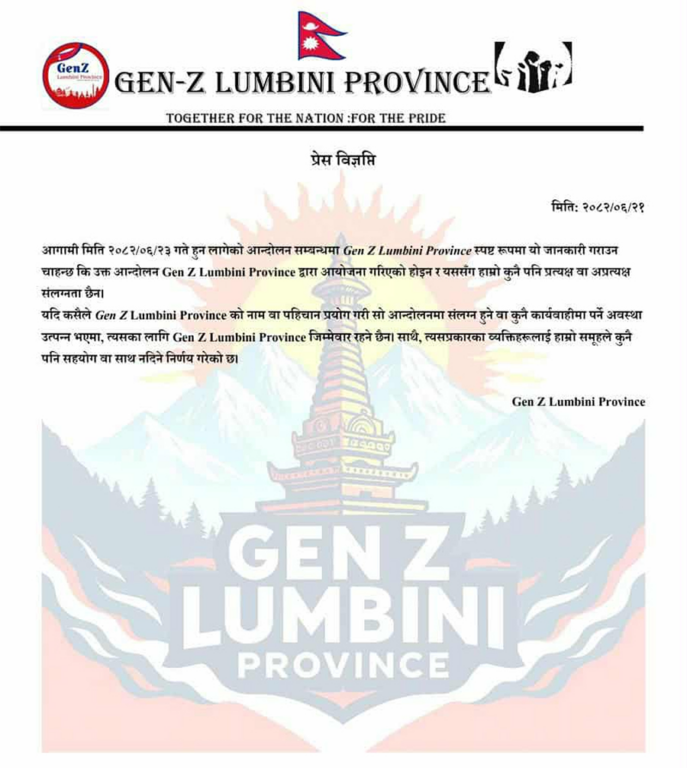 जेनजी लुम्बिनी संयोजक आदित्य आचार्यले प्रेस विज्ञप्ति जारी गर्दै असोज २३ गते हुने भनिएको आन्दोलन आफूहरुको आयोजनामा नहुने र त्यसमा प्रत्यक्ष वा अप्रत्यक्ष संलग्नता पनि नरहने स्पष्ट पारेका हुन् ।