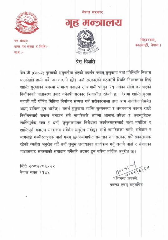 धर्ना, जुलुसलगायत विरोधका कार्यक्रमहरू गर्नुपर्दा सभ्य, मर्यादित र शान्तिपूर्ण बनाउन समेत मन्त्रालयले अपिल गरेको छ । आउँदो फागुन २१ गतेका लागि तय भएको चुनावको वातावरण तयार गर्नेतर्फ सरकार क्रियाशील रहेको पनि गृह मन्त्रालयले जनाएको छ ।