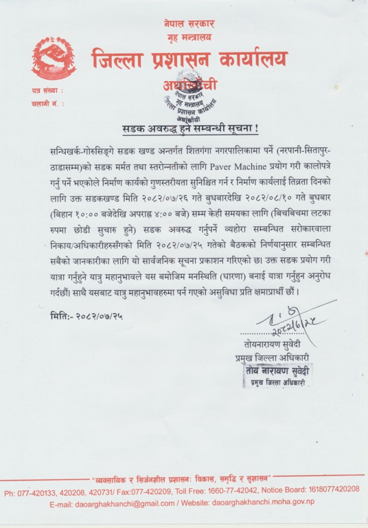 जिल्ला प्रशासन कार्यालय अर्घाखाँचीमा प्रमुख जिल्ला अधिकारी तोयनारायण सुवेदीको अध्यक्षतामा हिजो बसेको सर्वपक्षीय निर्णयअनुसार आजदेखि आउँदो मङ्सिर १० गतेसम्म दैनिक बिहान १० बजेदेखि दिउँसो ४ बजेसम्म सडक बन्द गरी मर्मत तथा स्तरोन्नतिको काम हुने भएको हो ।