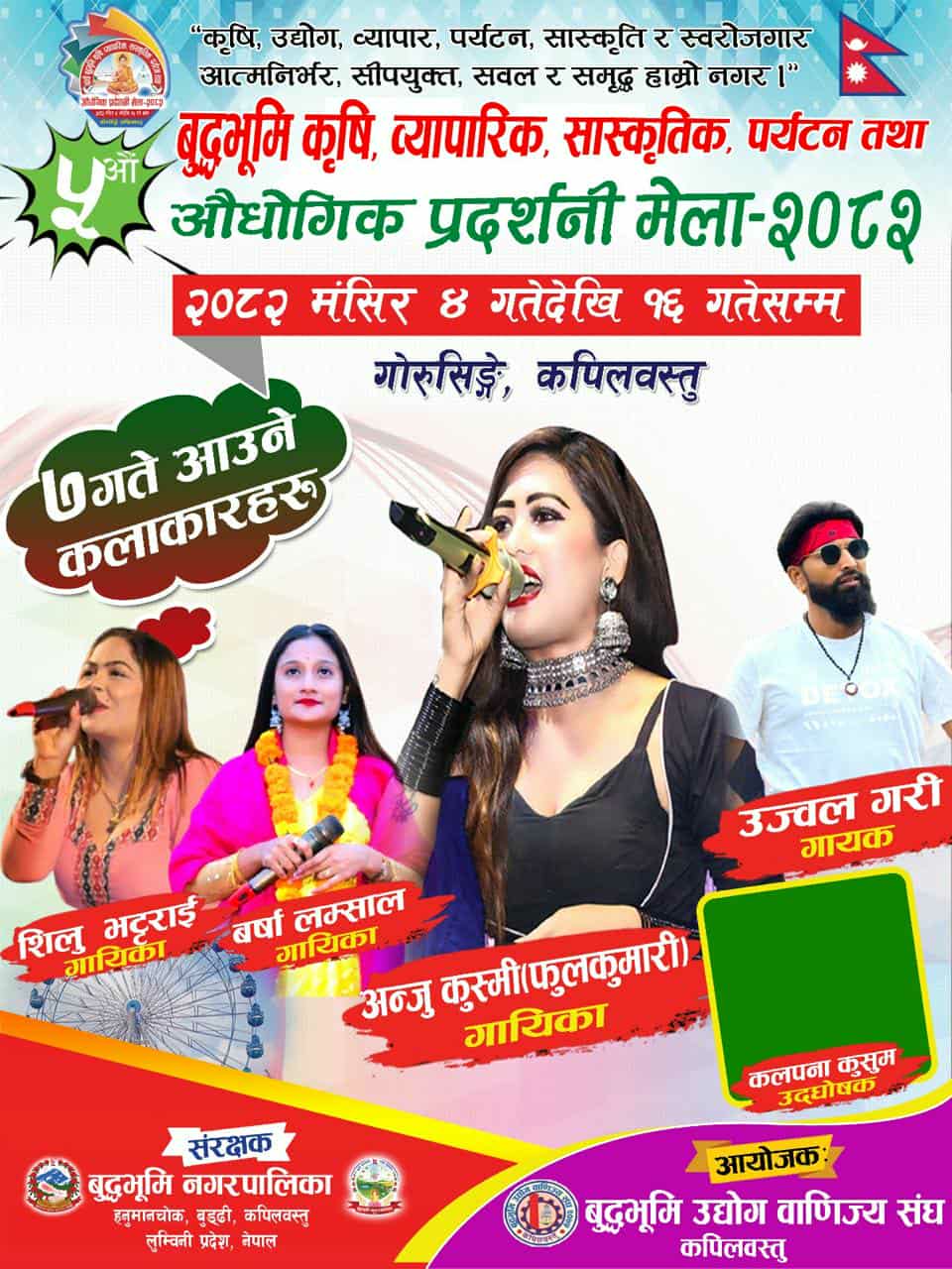 पाँचौ बुद्धभूमि महोत्सवमा आइतबार ४ कलाकारको धमाकेदार प्रस्तुती रहने भएको छ । बुद्धभूमि २ गोरुसिंगेमा यहि मंसिर ४ गतेबाट संचालन भएको महोत्सवमा आइतबार मंसिर ७ गते गायिका अन्जु कुस्मी(फुलकुमारी), लोक तथा दोहोरी गायिक शिलु भट्राई, वर्षा लम्साल तथा गायक उज्जवल गिरीलगाएतका कलाकारको प्रस्तुती रहने आयोजकले जनाएको छ । कृषि उद्योग, ब्यापार, पर्यटन, संस्कृती र स्वरोजगार आत्मनिर्भर सिपयुक्त, सवल र समृद्ध हाम्रो नगर भन्ने नाराका साथ सुरु भएको महोत्सव मंसिर १६ गतेसम्म चल्नेछ ।