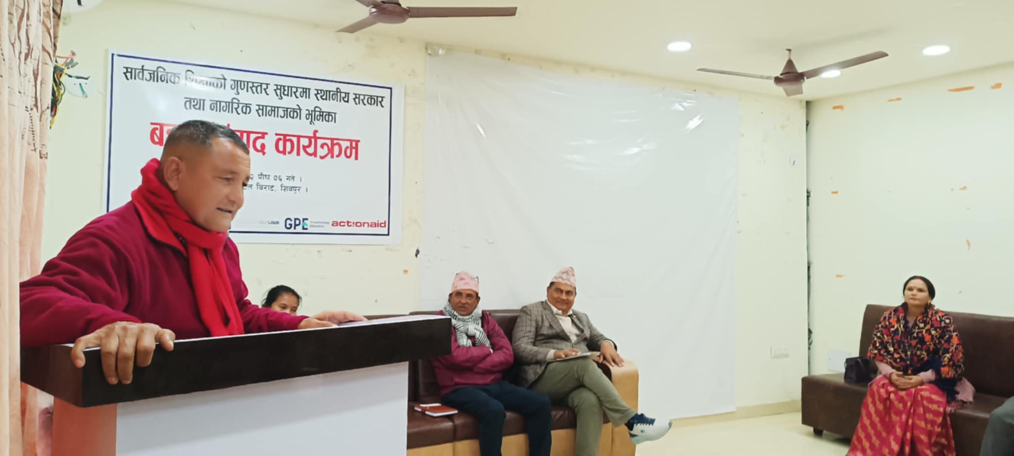 यसैगरी एक्सन एड नेपालका प्रतिनिधि चोपलाल बेल्वासेले शिक्षालाई उत्कृष्ट बनाउने उपायबारे तथा शिक्षाका लागि राष्ट्रिय अभियान नेपालका जिल्ला संयोजक हरि अधिकारीले स्थानीय तहको शिक्षा अवस्था, अपेक्षा र भूमिकाबारे प्रस्तुतीकरण दिनुभएको थियो।
