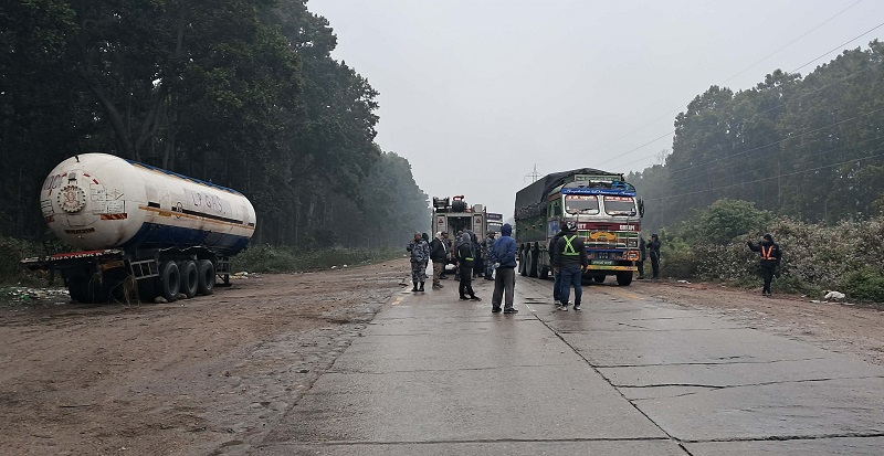 भारतबाट वीरगन्ज नाका हुँदै पूर्वतर्फका लागि छुटेको भारतीय नम्बरप्लेटको ट्यांकर हिजो बिहान साढे ७ बजे सडकको बीच भागमै पल्टिएको थियो । यस्तै निर्माणाधीन नारायणघाट–बुटवल सडक खण्डको दाउन्ने क्षेत्रमा शीतका कारण सडक चिप्लो हुँदा गाडी चलाउन समस्या हुँदै आएकोमा गिट्टी राखेर सञ्चालन गरिएको छ । तर गाडीको जाम उस्तै छ ।