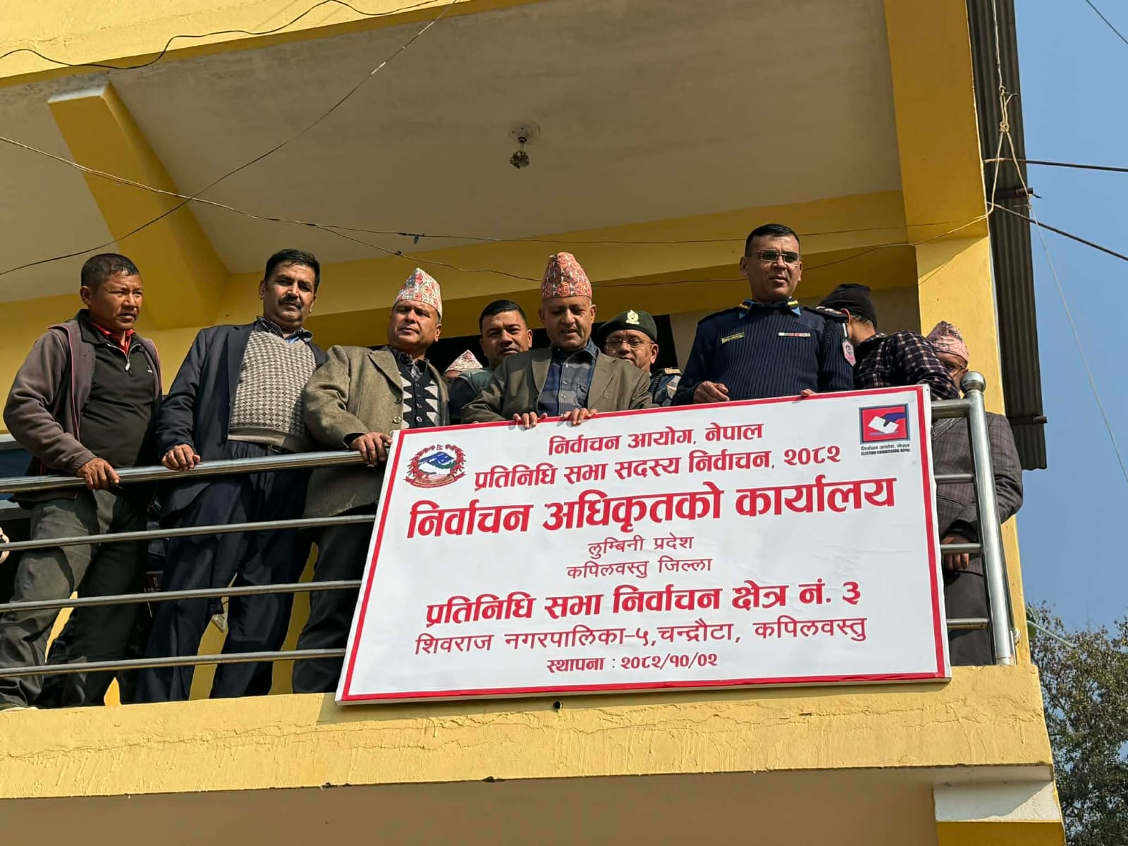 आगामी २१ फागुनमा हुने प्रतिनिधिसभा चुनावलाई लक्षित गर्दै कपिलवस्तु जिल्लामा मुख्य निर्वाचन अधिकृत तथा निर्वाचन अधिकृतको कार्यालय औपचारिक रूपमा स्थापना गरिएको छ । निर्वाचनलाई निष्पक्ष, शान्तिपूर्ण र व्यवस्थित रूपमा सम्पन्न गराउने उद्देश्यसहित कार्यालय स्थापना गरिएको हो । तीन वटा निर्वाचन क्षेत्र रहेको कपिलवस्तु जिल्लामा क्षेत्र नम्बर–१ का लागि बाणगंगा नगरपालिकाको कार्यालयमा, क्षेत्र नम्बर–२ का लागि जिल्ला समन्वय समितिको कार्यालय तौलिहवामा र क्षेत्र नम्बर–३ का लागि शिवराज नगरपालिका वडा नम्बर ५ चन्द्रौटा, दुर्गा मन्दिर सभाहल भवनमा निर्वाचन अधिकृतको कार्यालय स्थापना गरिएको छ ।