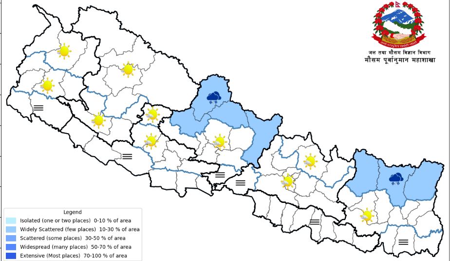 आज कोशी र गण्डकीका उच्च पहाडी तथा हिमाली क्षेत्रमा हल्का हिमपातको सम्भावना छ । ती क्षेत्रका एक/दुई ठाउँमा छिटपुट वर्षाको पनि हुन सक्ने जल तथा मौसम पूर्वानुमान महाशाखाले जनाएको छ ।