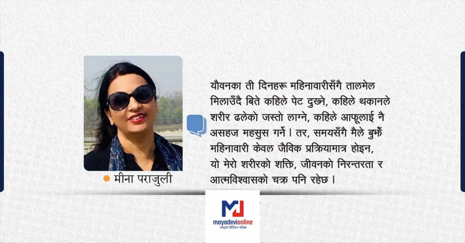 यौवनका ती दिनहरू महिनावारीसँगै तालमेल मिलाउँदै बिते कहिले पेट दुख्ने, कहिले थकानले शरीर ढलेको जस्तो लाग्ने, कहिले आफूलाई नै असहज महसुस गर्ने । तर, समयसँगै मैले बुझेँ महिनावारी केवल जैविक प्रक्रियामात्र होइन, यो मेरो शरीरको शक्ति, जीवनको निरन्तरता र आत्मविश्वासको चक्र पनि रहेछ ।