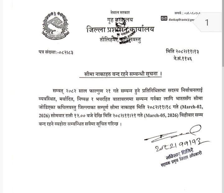 यसैबीच जिल्ला प्रशासन कार्यालय कपिलवस्तुका सहायक प्रमुख जिल्ला अधिकारी तथा निर्वाचन अनुगमन प्रमुख भविश्वर घिमिरेले प्रतिनिधि सभा सदस्य निर्वाचनलाई स्वच्छ, निष्पक्ष, भयरहित र मर्यादित वातावरणमा सम्पन्न गराउने उद्देश्यले भारतसँग जोडिएका कपिलवस्तु जिल्लाका सम्पूर्ण सीमा नाकाहरू आजराति सोमबार १२ बजेदेखि बिहीबार राती सम्म बन्द रहने सार्वजनिक सूचना जारी गर्नुभएको छ ।