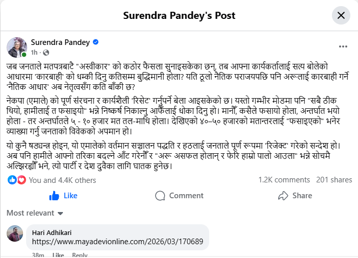 जब जनताले मतपत्रबाटै अस्वीकार को कठोर फैसला सुनाइसकेका छन्, तब आफ्ना कार्यकर्तालाई सत्य बोलेको आधारमा कारबाहीको धम्की दिनु कतिसम्म बुद्धिमानी होला? यति ठूलो नैतिक पराजयपछि पनि अरूलाई कारबाही गर्ने नैतिक आधार अब नेतृत्वसँग कति बाँकी छ?