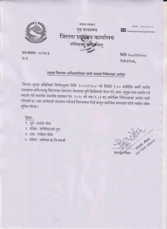 हालको सुरक्षा अवस्थालाई मध्यनजर गर्दै सम्भावित अप्रिय घटना रोक्नका लागि निषेधाज्ञा जारी गरिएको जनाइएको छ।
