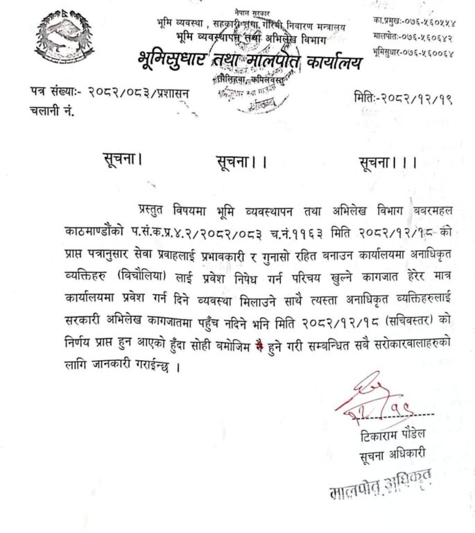 सूचनामा कार्यालयभित्र परिचय खुल्ने कागजातका आधारमा मात्र प्रवेश दिइने तथा अनाधिकृत व्यक्तिलाई सरकारी अभिलेख तथा कागजातमा पहुँच नदिने स्पष्ट उल्लेख गरिएको छ। यस कदमले विगतमा मालपोत र नापी कार्यालयमा देखिँदै आएको विचौलिया सक्रियता तथा अनावश्यक खर्च नियन्त्रणमा आउने विश्वास गरिएको छ।
