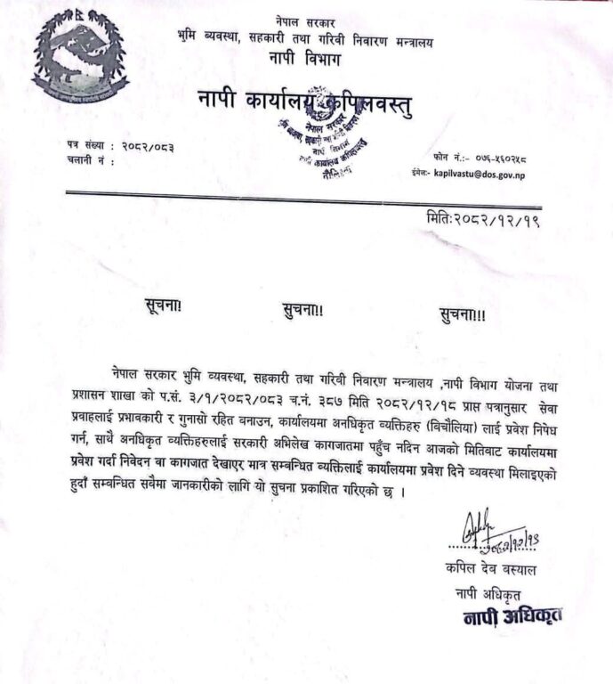 भूमि व्यवस्थापन तथा अभिलेख विभागअन्तर्गतको मालपोत कार्यालय र नापी विभागअन्तर्गतको नापी कार्यालय कपिलवस्तुले छुट्टाछुट्टै सूचना जारी गर्दै कार्यालयभित्र विचौलियाको प्रवेश निषेध गरिएको जनाएका छन्। अब सेवाग्राहीले आफ्ना कामका लागि अनाधिकृत व्यक्तिको सहारा लिनु नपर्ने र आवश्यक कागजातसहित सिधै कार्यालयमा उपस्थित भएर सेवा लिन सक्ने व्यवस्था गरिएको छ।