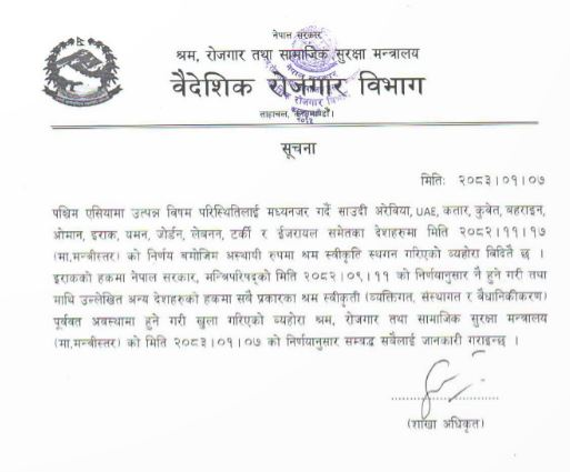 वैदेशिक रोजगार विभागका अनुसार साउदी अरब, युएई, कतार, कुवेत, बहराइन, ओमान, इराक, यमन, जोर्डन, लेबनान, टर्की र इजरायलमा श्रम स्वीकृति खुला गर्ने निर्णय भएको हो ।