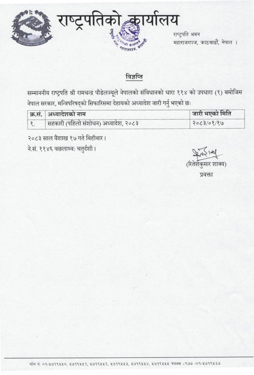राष्ट्रपति रामचन्द्र पौडेलले सहकारी (पहिलो संशोधन) अध्यादेश २०८३ जारी गर्नुभएको छ ।