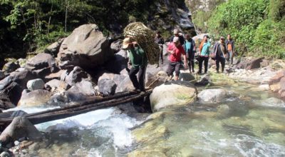 मौरीको मह काढ्न डोरी बोक्दै युवा