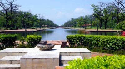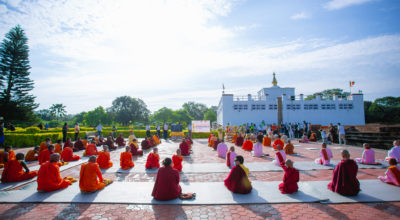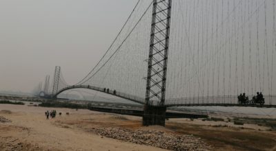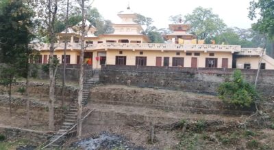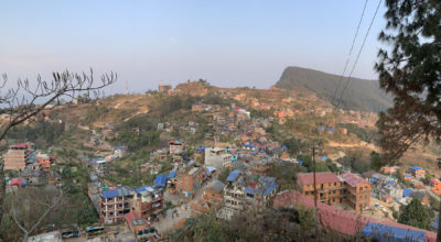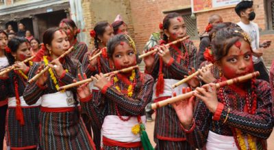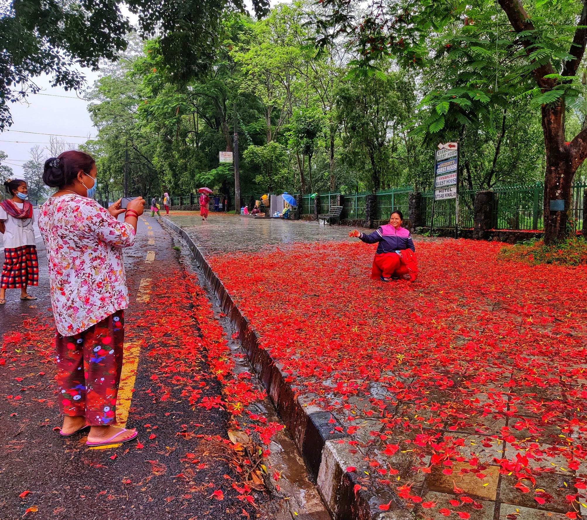 पोखरा महानगरपालिका–६ फिस्टेल अगाडि भुइँमा झरेको गुलमोहर फूलसँग तस्वीर खिच्दै महिला ।तस्वीरः राधिका कँडेल, रासस ।