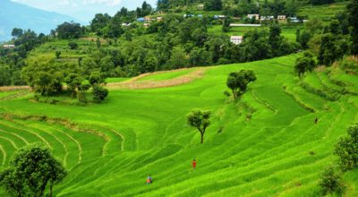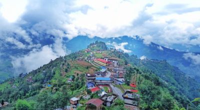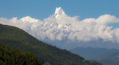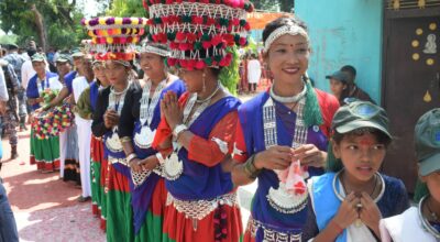 सूर्योदयको घामको किरणले झुल्केको चामे मनाङबाट देखिने सुनौलो मनास्लु हिमाल । जसको उचाइ समुद्री सतहदेखि आठ हजार १६३ मिटर छ । तस्बिर: नवीन लामिछाने/रासस