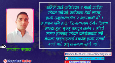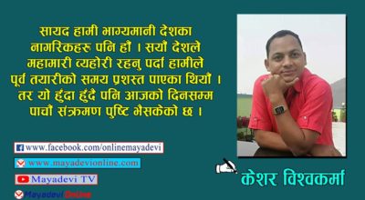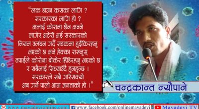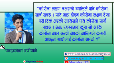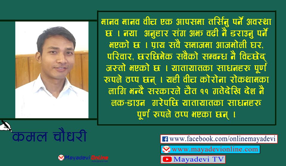 कमल चौधरी । विश्वभरी महामारीको रूपमा फैलिएको कोरोना भाइरस (कोभिड–१९) ले यतिबेला विश्व समुदायलाई नै आतकिंत वनाइरहेको छ । मानव मानव वीच एक आपसमा तर्सिनु पर्ने अवस्था छ । नयाँ अनुहार संग अझ वढी नै डराउनु पर्ने भएको छ । प्राय सवै समाजमा आजभोली घर, परिवार, छरछिमेक सबैको सम्बन्ध नै विच्छेद् जस्तो भएको छ ।…