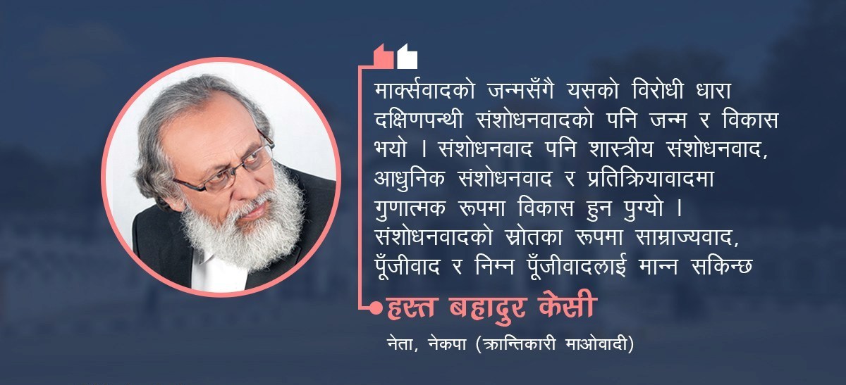 हस्तबहादुर केसी ।मार्क्सवादको उदयले विश्व मानव समाजमा ठुलो क्रान्ति ल्यायो र हलचल नै पैदा गरिदियो । मार्क्सवादको जन्मसँगै यसको विरोधी धारा दक्षिणपन्थी संशोधनवादको पनि जन्म र विकास भयो, मार्क्सवादको जुन लेनिनवाद र माओवादमा विकास हुन पुग्यो । त्यसैगरी संशोधनवादले पनि शास्त्रीय संशोधनवाद, आधुनिक संशोधनवाद र प्रतिक्रियावादमा गुणात्मक रुपमा विकास गर्न पुग्यो । संशोधनवादको स्रोत साम्राज्यवाद,…